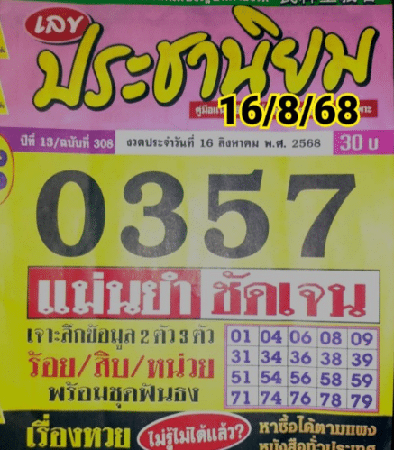 หนังสือหวยประชานิยม ชุดตัวเลขที่มาแรงสุด ๆ แบบฉุดไม่อยู่ เป็นแนวทางระดับหัวแถวเลยก็ว่าได้ มาเหนือและมาแบบเป็นดาวรุ่งเลย เป็นที่ถามหาถามถึงกันเข้ามามากมาย แนวทางหวยไทย หวยประชานิยมงวดนี้ ยืนหนึ่ง ในด้านการค้นหา และการเสิร์ชหา นิยม หวย เป็นแนวทางหวยที่เป็นที่นิยมสมชื่อมาก ๆ โดยเขาจะมาในรูปแบบเน้นตัวเลข 2 ตัวตรงเป็นหลัก และก็จะมีตัวเลขเรียง 4 ตัวเด่น ๆ มาให้ด้วย เผื่อสำหรับคอหวยไทยท่านใด สนใจอยากจะตีเลข หรือเก็งเลข เป็นเลข 3 ตัวตรง ก็จัดก็คำนวณเอาเองได้เลยตามใจชอบ แต่ขอบอกเลยว่าแนวทาง หวยประชานิยมล่าสุด งวดนี้วันที่ 1 กันยายน 2568 ห้ามพลาด!